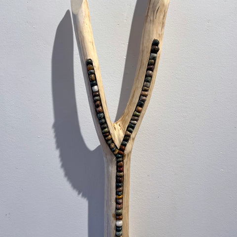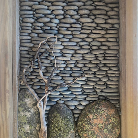 The work is naturally formed colourful granite and limestone from Nova Scotia, layered colours of gneiss from Newfoundland, slate from Vermont and limestone and sandstone from New Brunswick. Combining these ocean sculpted stones with twisted driftwood to make striking home decor.
