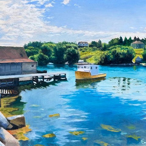 Margaret Louise is an artist from the south shore of Nova Scotia who has been studying and working in various cities in Europe over the last five years. Though her surroundings have changed she continues to depicts rural, coastal images of the Maritime landscape as she understands that the tranquilly of these scenes leaves room for her bold imaginative style.