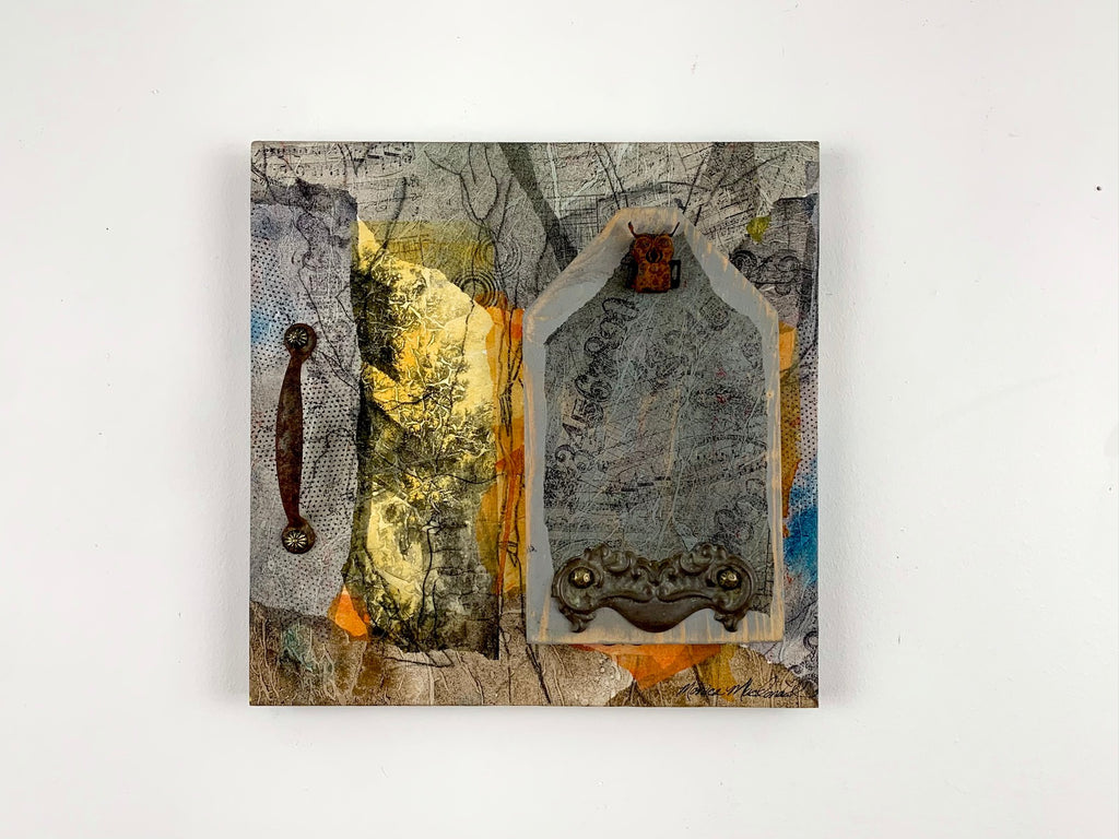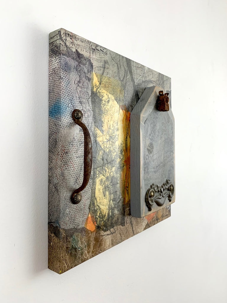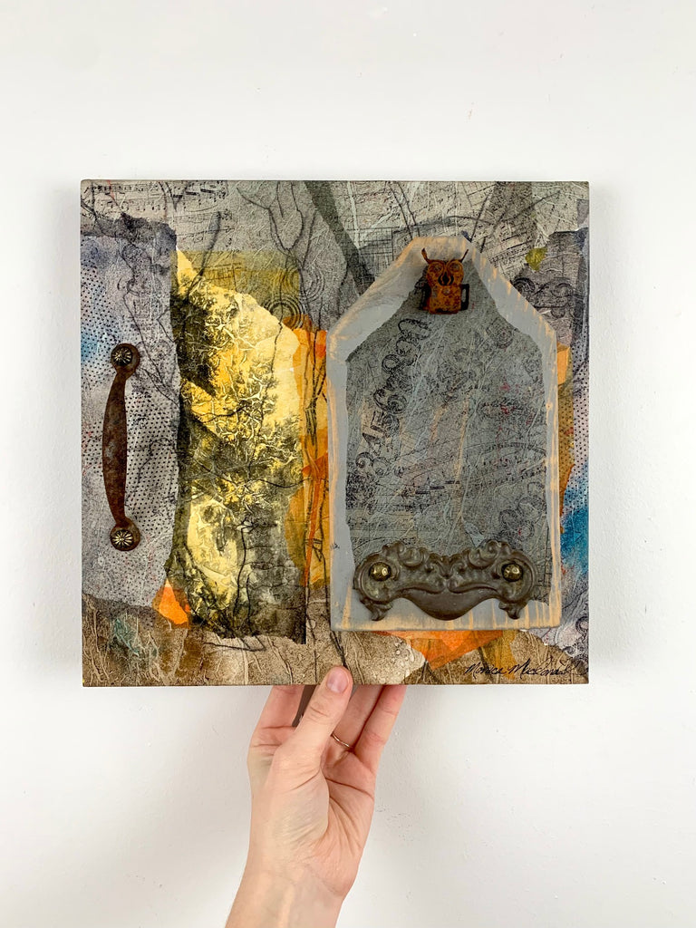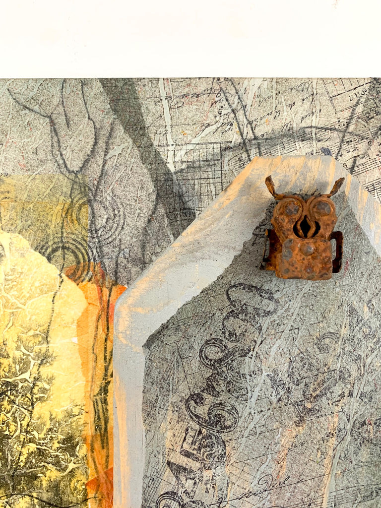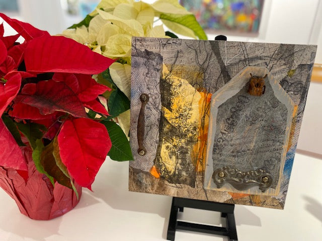“I am using a combination of collage and found objects to reflect on our understanding of what it means to be home for Christmas …. to be Home.Our experiences of Christmas and our concepts of Home are complex and multilayered. They are viewed through a veil of memory and emotion and bathed in a patina of tradition, imagination and mystery. How much is truth? How much is nostalgia? What does “Home for Christmas” mean to you?”