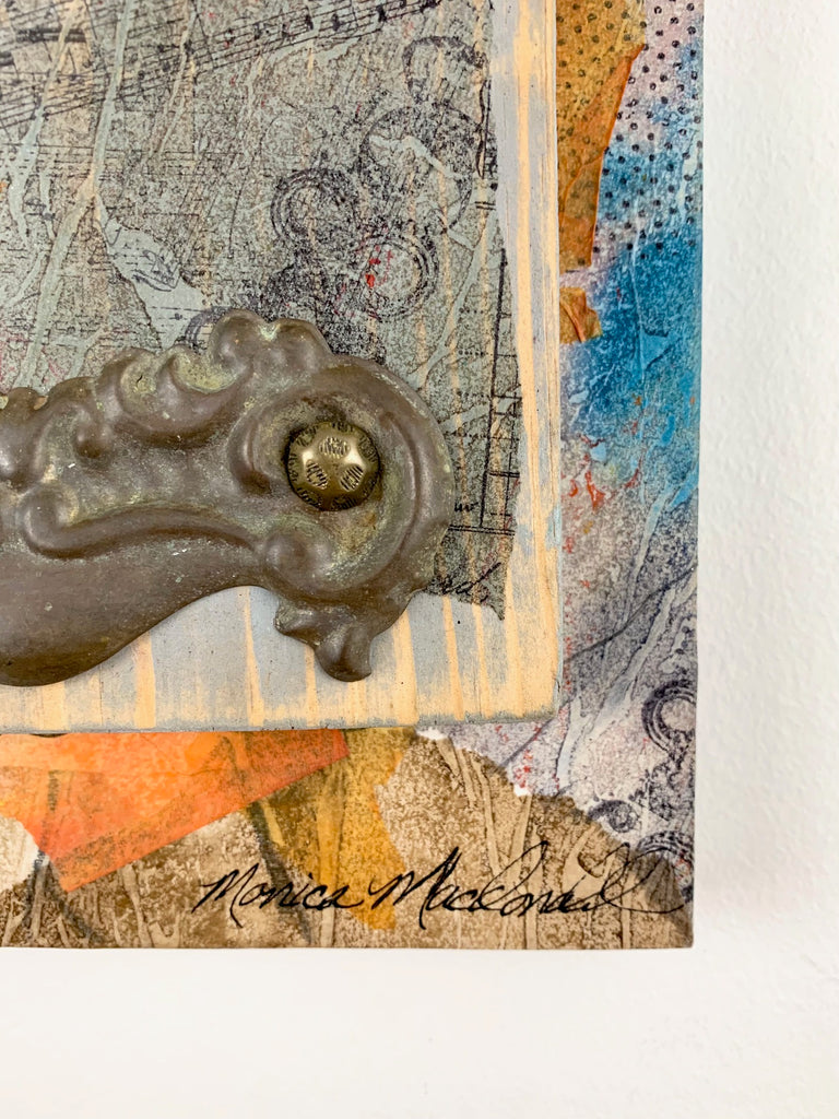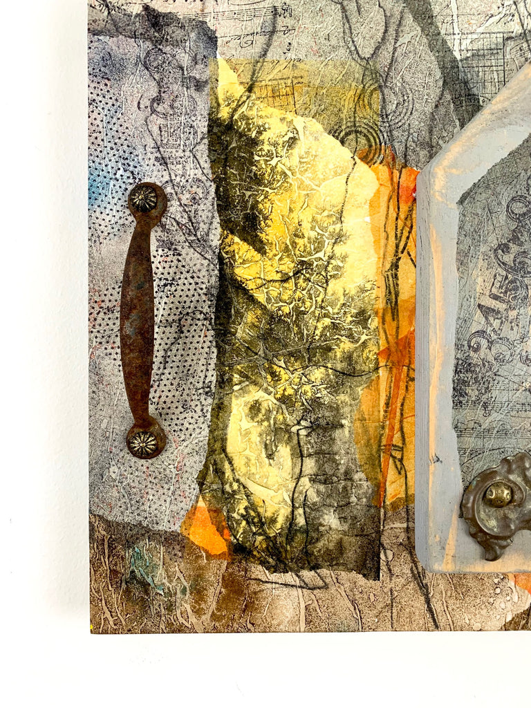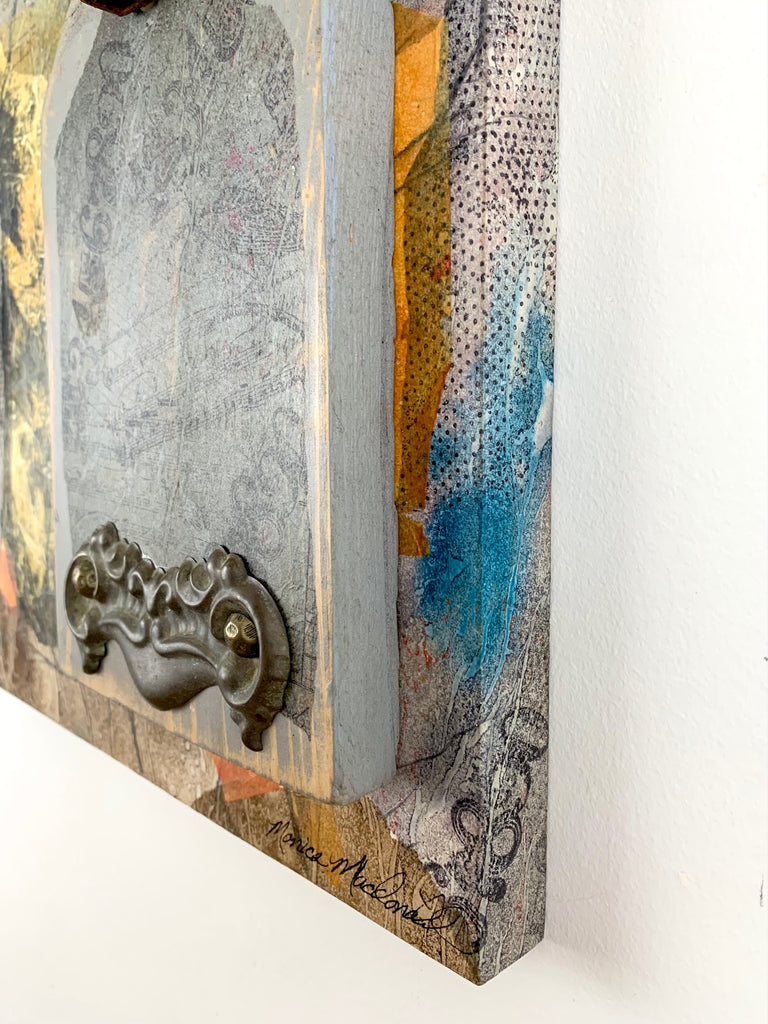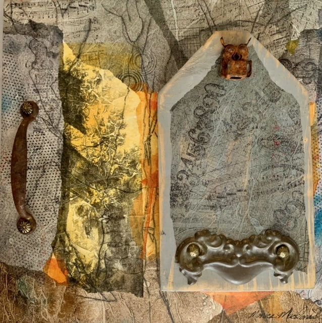 “I am using a combination of collage and found objects to reflect on our understanding of what it means to be home for Christmas …. to be Home.Our experiences of Christmas and our concepts of Home are complex and multilayered. They are viewed through a veil of memory and emotion and bathed in a patina of tradition, imagination and mystery. How much is truth? How much is nostalgia? What does “Home for Christmas” mean to you?”
