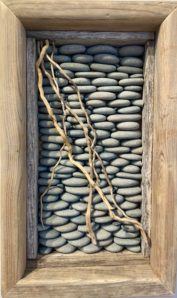 The work is naturally formed colourful granite and limestone from Nova Scotia, layered colours of gneiss from Newfoundland, slate from Vermont and limestone and sandstone from New Brunswick. Combining these ocean sculpted stones with twisted driftwood to make striking home decor.