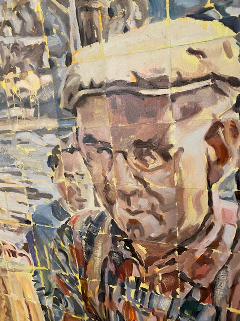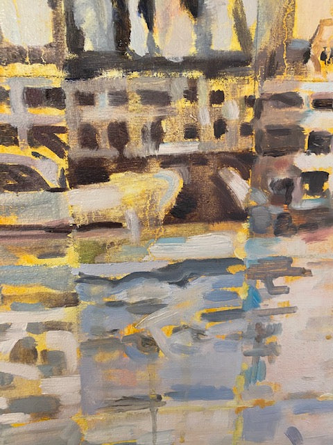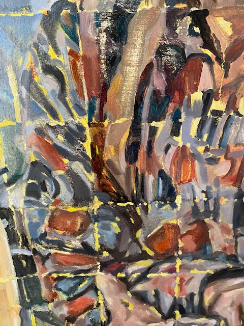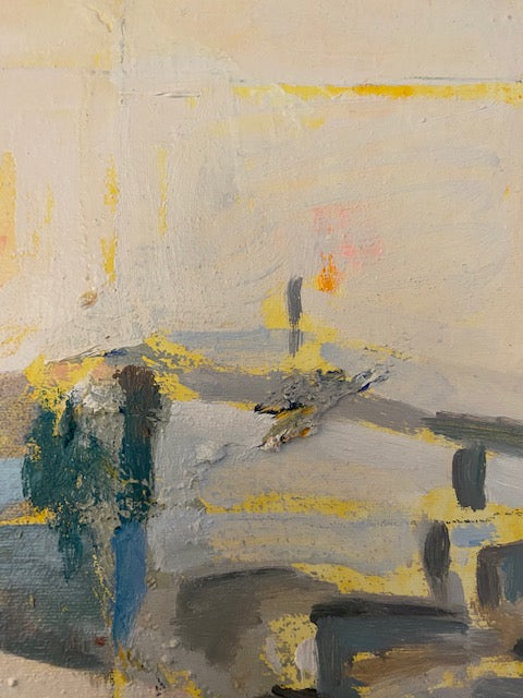 This painting is based off an old found image of Pushthrough, a town on Newfoundland's south coast which has been an inspiration for many paintings by the artist. The grid is used as a tool to transfer the image onto the canvas and is emphasized for visual interest which is becoming a signature style in Margaret Louise's work.