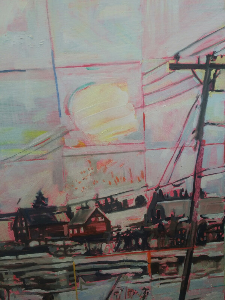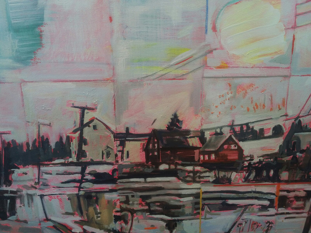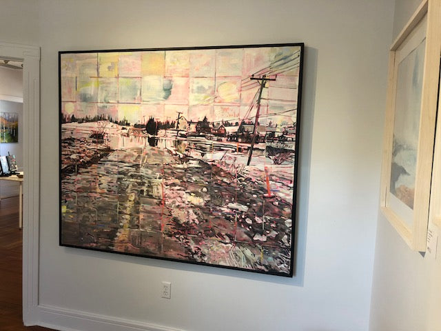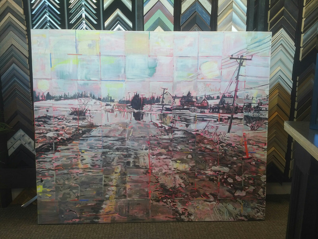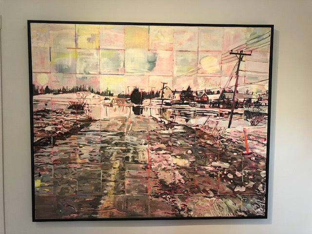 This painting is made from a reference photo of a flood in the rural Maritimes. The painting's marks are very deliberate and planned resulting in a crisp image. Within the grid shown, one section was painted at a time at random and separate colours were mixed for the same purpose but by using the right tone it functions correctly and results in greater visual interest.