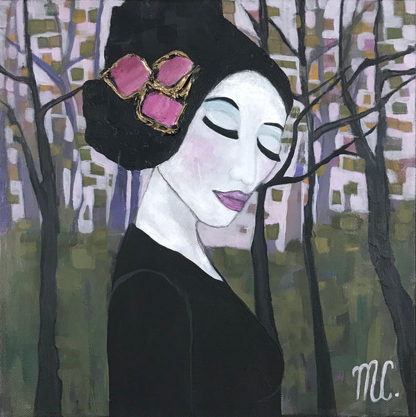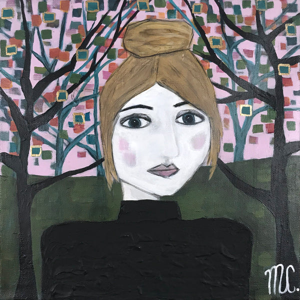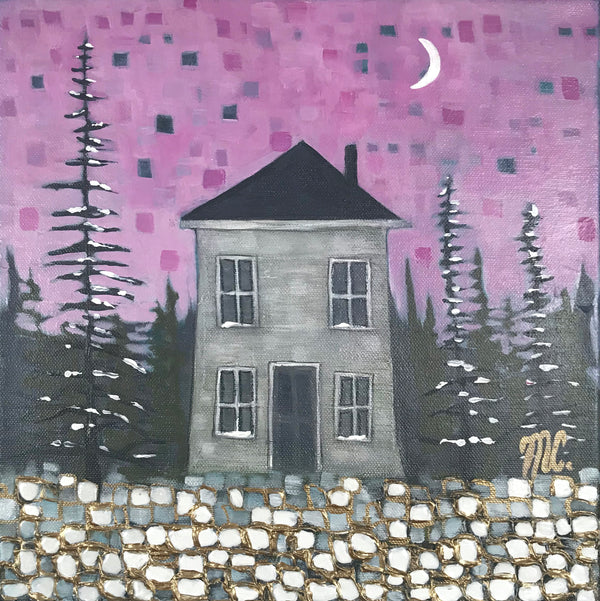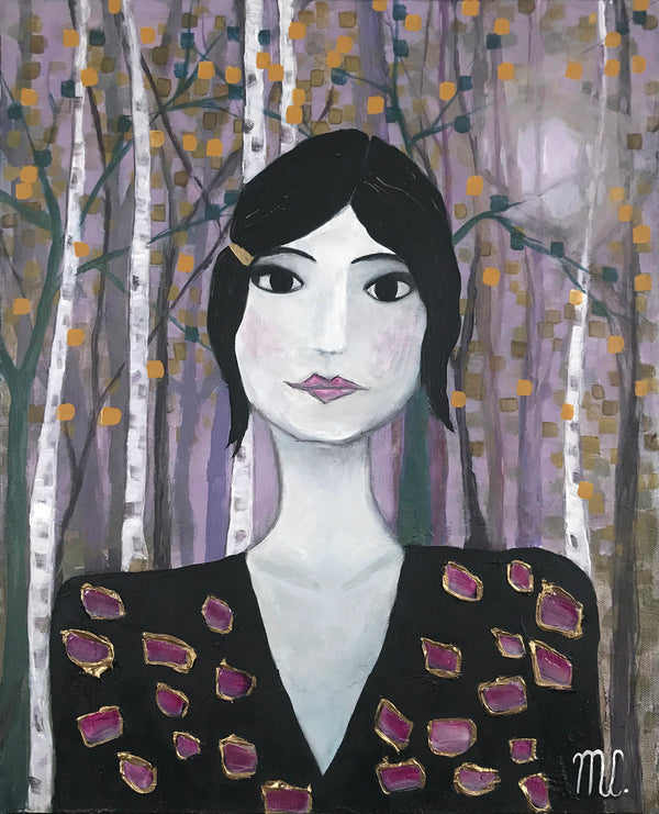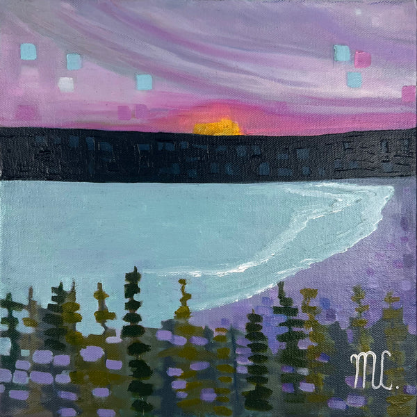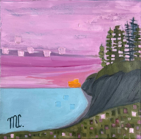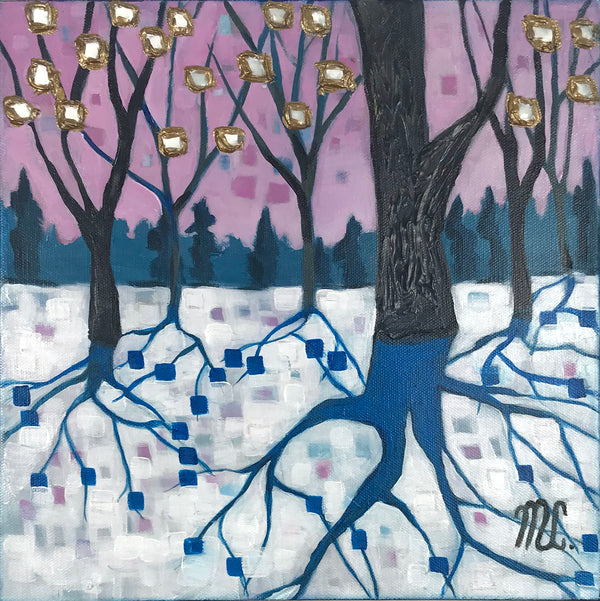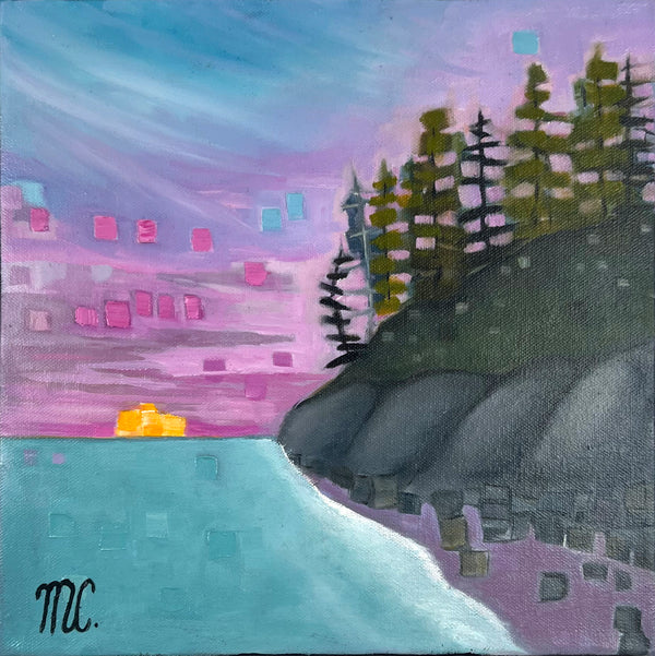 Melanie Currie Unsworth is a self-taught Canadian artist. Living on the island of Cape Breton, she draws her inspiration from the rugged landscape and ever-changing seasons. Melanie has had a long-standing involvement with the arts over her lifetime. Many of the skills she acquired from her work as a chef and wedding cake designer translate into practice with creating painted work. What truly captivates Melanie are the abstract qualities found in nature. She is fascinated by the varied lines, shapes, shadows, and colours which exist around us. Melanie uses a combination of palette knives and brushes to fabricate the depth, tone, and colour of the subjects. While staying true to portrayal of realistic elements (i.e. form of trees), she prefers to incorporate hues and tones from the environment at large. An example of this would be reflecting colours of the evening sky in the branches and leaves of the trees portrayed. The intention of this is to infuse realistic elements with abstract overtones. She also employs metallic paints and pouring medium to create an effect similar to stained glass.