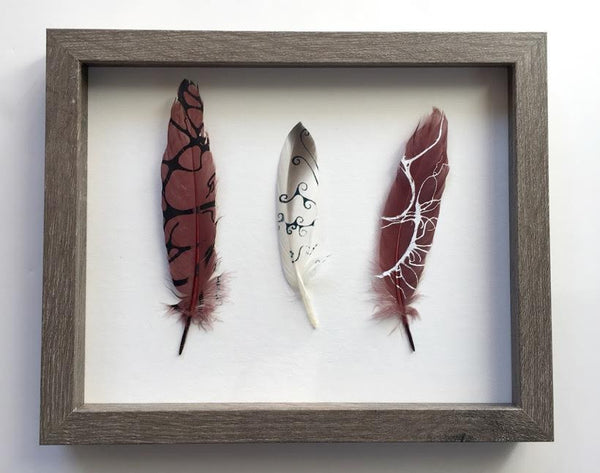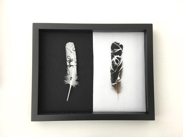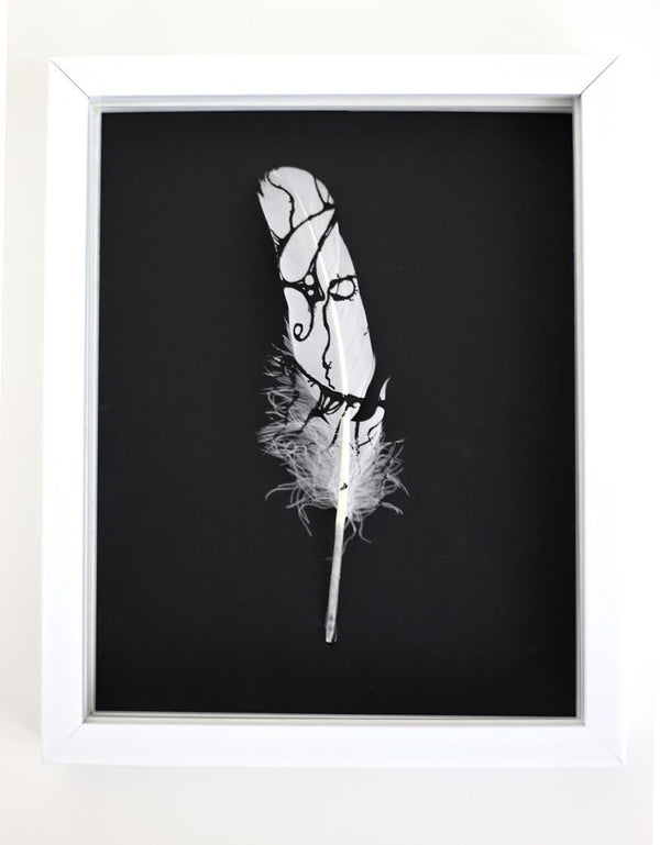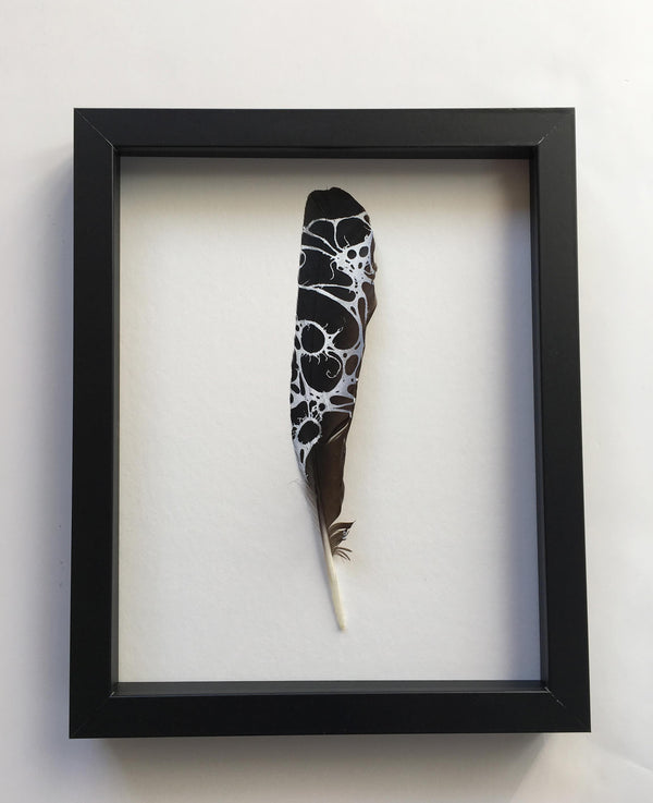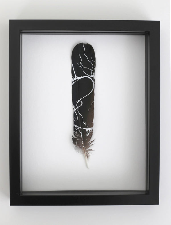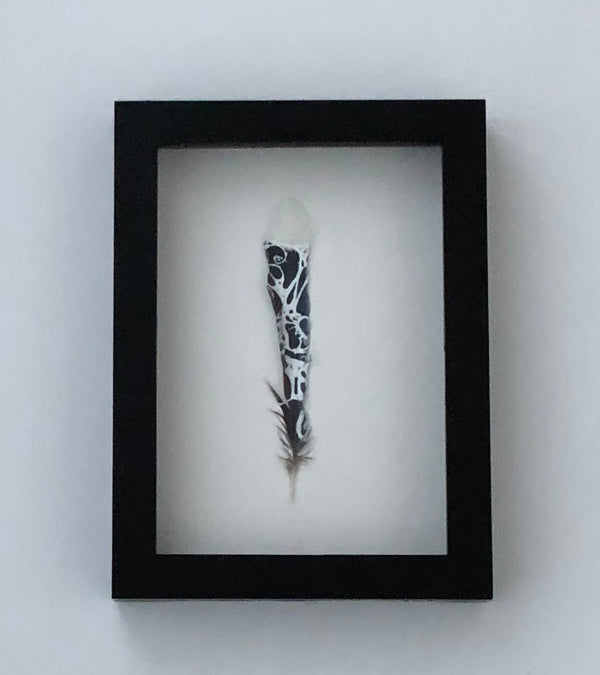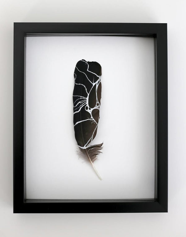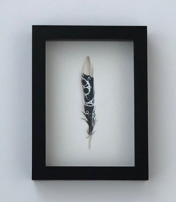 Miya Turnbull, Nova Scotia. Miya Turnbull is a multi-disciplinary artist working primarily with mask-making, performance and media arts, and also has a parallel practise working with textiles, screen printing and painting. Her feathers sold here at 14 Bells Fine Art Gallery are screen printed with her original designs inspired by nature and "Ki" (translating to Universal Life Force). The majority are found feathers from Nova Scotia and Alberta; a variety of Crow, Magpie, Seagull, Goose, Duck, Pigeon and Blue Jay.