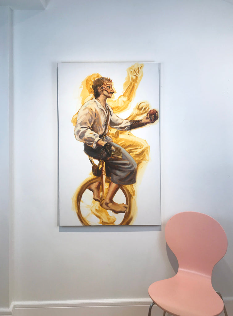 As both a performer and a visual artist I find myself fascinated by movement, and depictions of movement that capture the vivacity of their subjects. This series was created for my show ‘Marvelous Miscreants’ at the Anna Leonowens Gallery, which aimed to invite viewers into an appreciation for the artistry of circus. As audience members, a circus is somewhere to escape the mundane, to be inspired and awed. As performers, it is a traveling home made of people and wonder and shared stories. I collaborated with each performer to create costumes and record a routine of their creation. The ensuing paintings were an exercise both in distilling their performances into a handful of poses, and in letting go, as each new pose involved obscuring the one underneath.